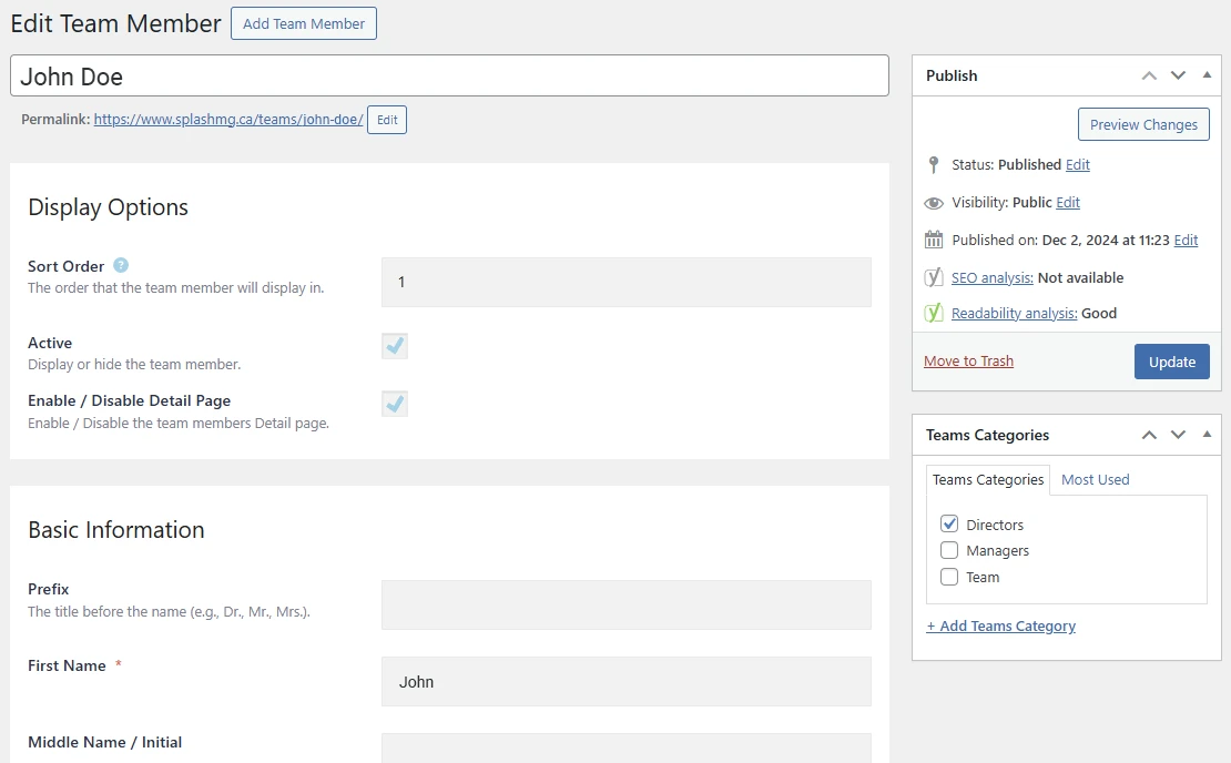 - Name & Permalink: If you modify the name at the very top of the page, make sure you edit the permalink below it to match. For example, if you modified John Doe to be John Edward Doe, the permalink would need to change from john-doe to john-edward-doe. The permalink must be lower-case and words separated by hyphens.